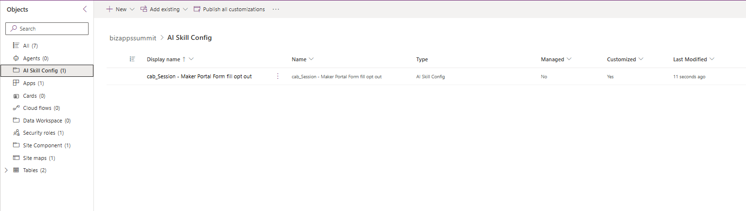A closer look at the solution showed, that when disabling the option, a new “AI Skill Config” configuration object is added to the solution, which is not shown in the classic editor.